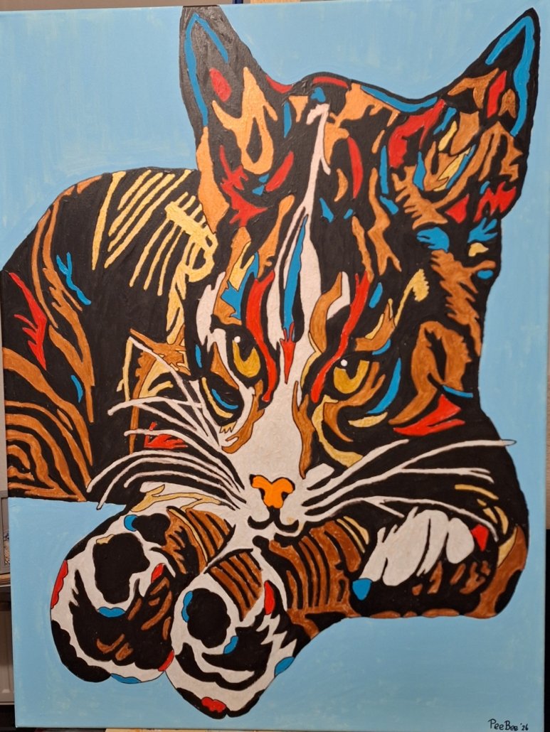 Kleurrijk, speels en expressief “portret” van een Grote Poes dat direct sfeer geeft aan elke ruimte. Met felle tinten en verrassend lijnenspel is dit schilderij een echte blikvanger in je woonkamer, kantoor of hobbykamer.