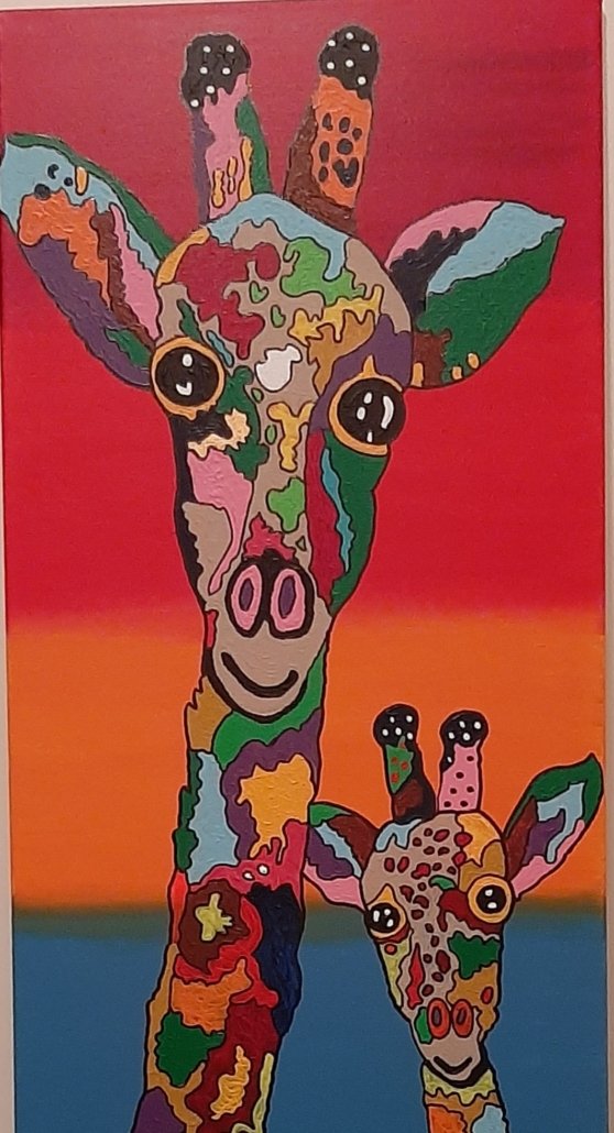 Kleurrijk, speels en expressief “portret” van een Giraffe met een jong dat direct sfeer geeft aan elke ruimte. Met felle tinten en verrassend lijnenspel is dit schilderij een echte blikvanger in je woonkamer, kantoor of hobbykamer.